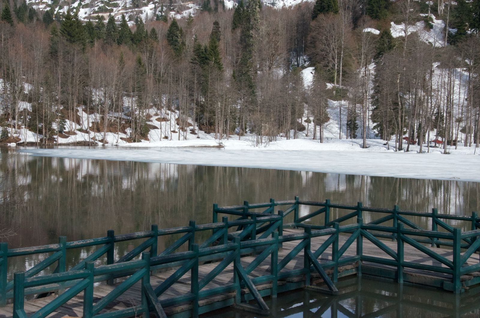 İki gündür uzaktan gördüğümüz karlara artık yavaş yavaş yaklaşıyoruz. Yolda bir inek sürüsü yolumuzu kesiyor önce, sonra tavuklar… Karagöl Milli Parkı’na yaklaştıkça yol kötüleşmeye, karlı dağlar etrafımızı sarmaya başlıyor. İşte bunu beklemiyorduk 🙂 Yol boyunca minik minik şelaleler yol kenarından modumuzu yükseltiyor. Aktif olarak işletme olmasa da içeride, park girişinde ücret kesmeleri ilginç ki burası da özelleştirilmiş durumda. Neyse, artık yol kenarındaki karlar iki adam boyuna ulaştı. Şaşkınlık içindeyim. Karadeniz’de anladığım bir şey varsa eğer turistik bir bölgeye doğru gidiyorsanız ve eğer yolun asfaltında sorun varsa, aradığınızda oteller yanıt vermiyorsa eğer o bölge daha sezonu açmamış anlamına geliyor. İşte şu an da böyle bir durumun içindeyiz. Eriyen karlı bölgelerde yollar su altında, ya Allah giriyorsunuz arabayla. Dallar yolları kapatmış olabiliyor. Yollarda toprak kaymalarını görmek artık rutinimiz oldu falan filan. Milli parkın içinden geçtiğimiz kısa bir yolculuk sonrası gölün kenarındayız. Birkaç piknikçi ve bizden başka kimse yok gölün etrafında. Ama ne güzellik! Etrafımız kar, güneşli bir hava, gökyüzünün yansıması göle vururken, gölün yarısı da hala donuk durumda… Yine bir doğa harikası sunuyor Karadeniz bize…