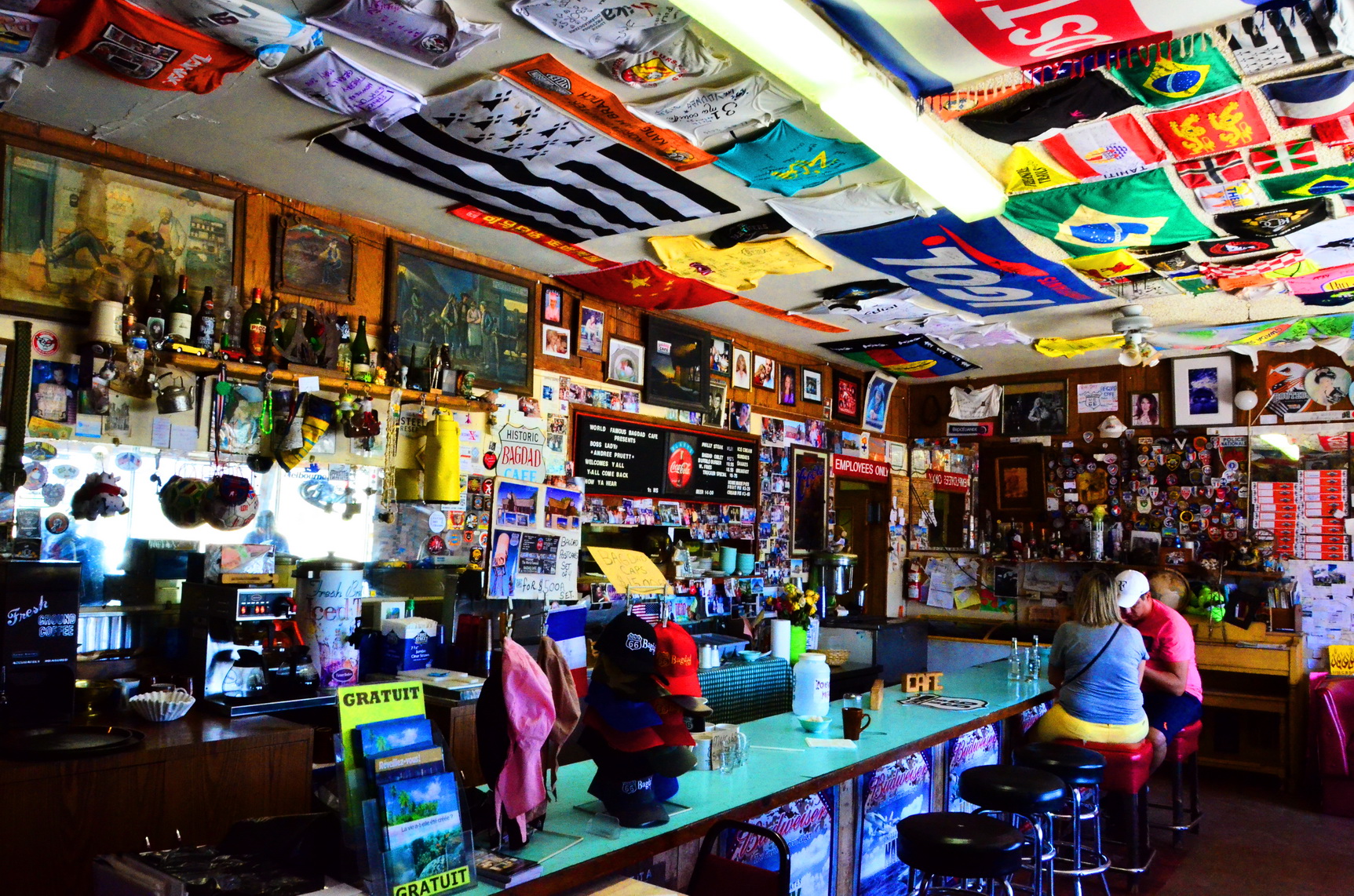 Route 66 yolunun önemli noktalarına bizden birşey bıraktık hep… Çoğu hediyelik eşya satan mağazada ya da cafelerde gelen ziyaretçiler için defter yapmışlar. Onlarcasına girdik çıktık hiçbirinde son 10 yıl geride gittiğini bildiğim birkaç isim olmasına karşılık biz Türk ismine hiç rastlamadık… Kaldı ki oraya yazanların kaçı bu yolun tamamını yaptılar ve kaçı bu tarihi yolun en eski rotasını takip etti ayrı bir soru işareti? Bu bir taraftan bizi üzdü, diğer açıdan da mutluluk vericiydi tabii… Ama belki siz gittiğinizde, artık tanıdığınız birisi oradan geçmiş olacak… Ve bazı yerlerde bizden bazı izlerle de karşılaşabilirsiniz… Mesela Arizona’daki Bagdad Cafe’de… Amarillo’da ikinci el eşyalar satan o büyük dükkanda…
