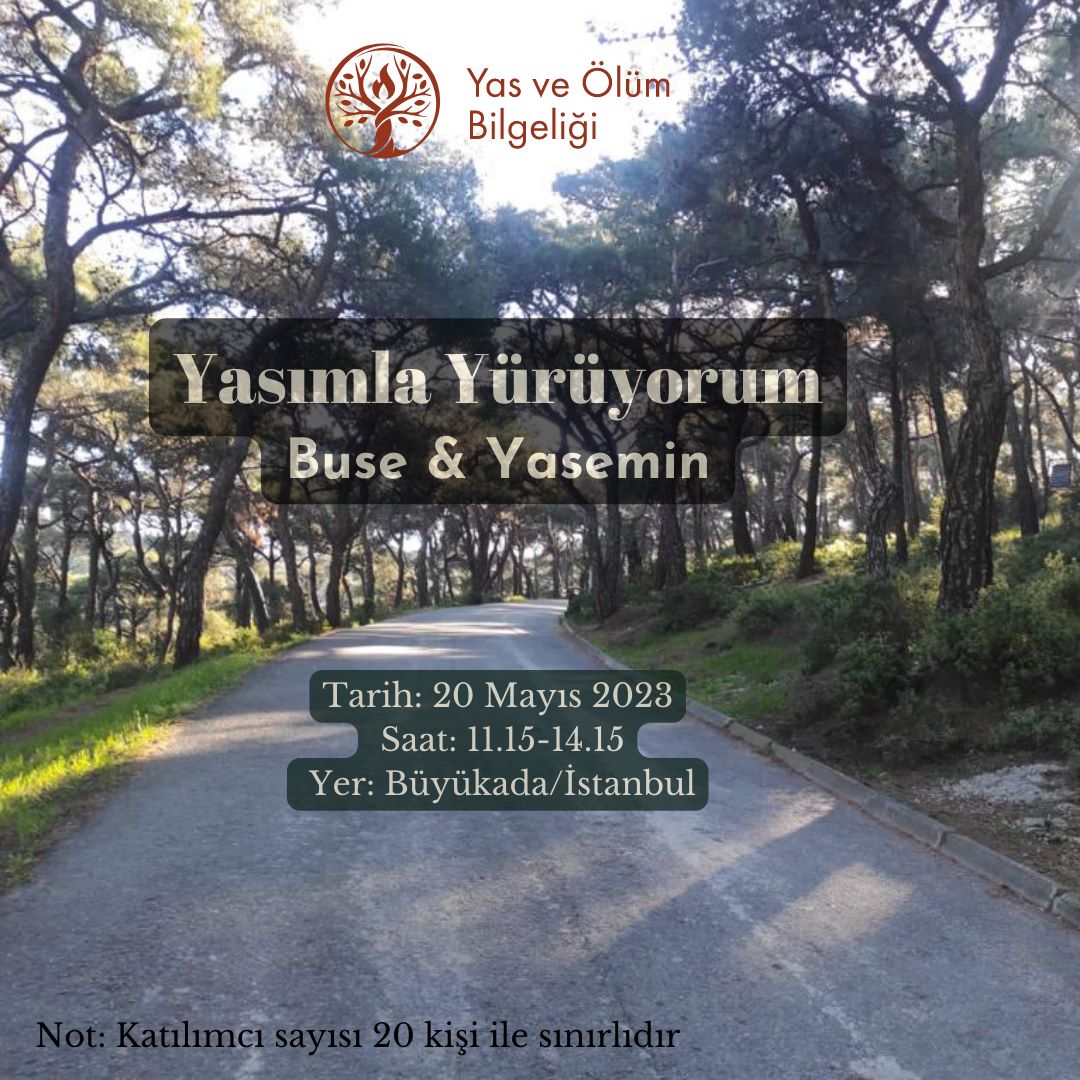 Yasımla Yürüyorum etkinliği için 20 Mayıs 2023 Cumartesi günü 11.15’te Büyükada Şehir Hatları İskelesi önünde buluşuyoruz. Ormana giriş öncesi yapacağımız bilgilendirme sonrası yürüyüşümüz başlayacak. Dinleneceğimiz ve çemberimizi yapacağımız alana kadar yürüyüşümüze sessizliğimiz eşlik ediyor olacak.